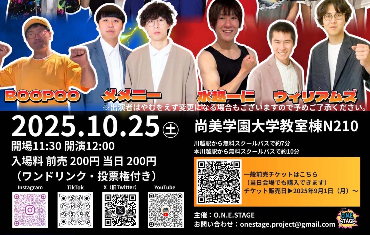 学生団体「O.N.E.STAGE」は、2025年10月25日(土)にお笑いイベント「笑撃〜Who’sthe Next Big Star?!〜」を尚美学園大学教室棟 N210 にて開催いたします。本イベントは「未来のスターを見つけよう」をテーマに掲げた、学生主催による観客参加型学園祭お笑いライブです。企画から運営まですべて学生が手掛け、観客の皆様が審査員となって対戦結果を決める、これまでにないスリリングなステージをお届けします。