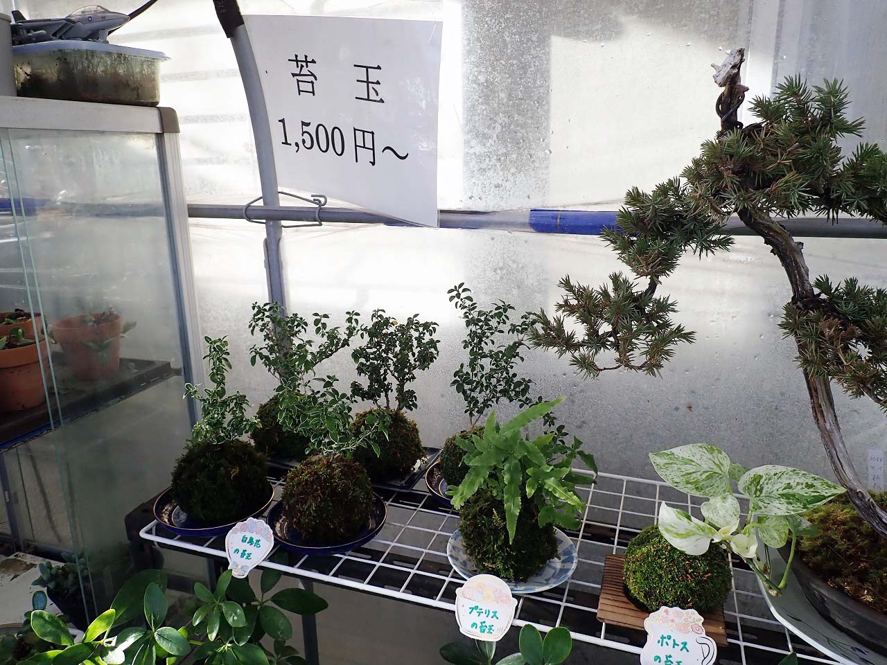 先に「住宅街の“こけ&めだか”の店」と触れましたが、ここでいう「こけ」は植物の「苔」です。本当にたくさんの「こけ」(あるいはこけ玉)を販売しています。