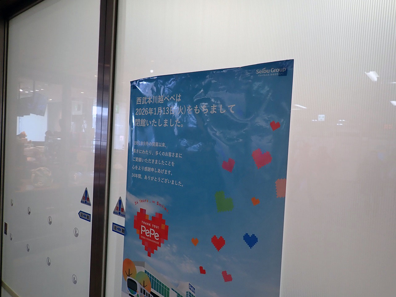 この号外NET川越市で以前に紹介していますが、西武新宿線・本川越駅直結の大型商業施設『西武本川越ペペ』が2026年1月13日をもって閉館しました。