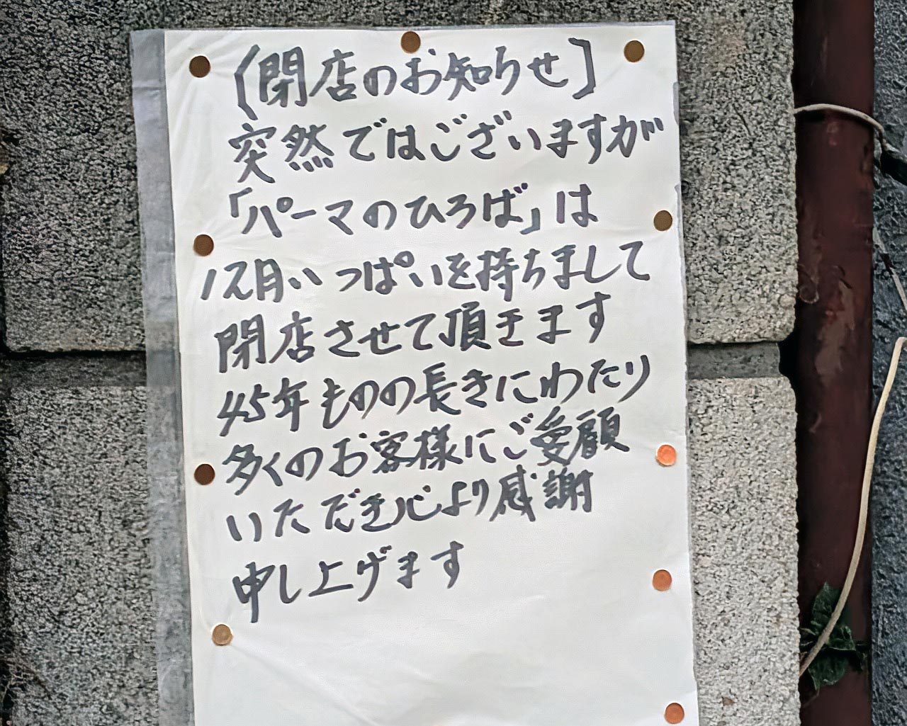 11月に閉店した三久保町の『玉鉉ラーメン』の並びの美容室『パーマのひろば』さんが、昨年の12月いっぱいで閉店しました。45年という、非常に長い間営業されていました。閉店の案内は今は掲示されていませんが、貼られていた時に撮影した写真があるので、お送りします。