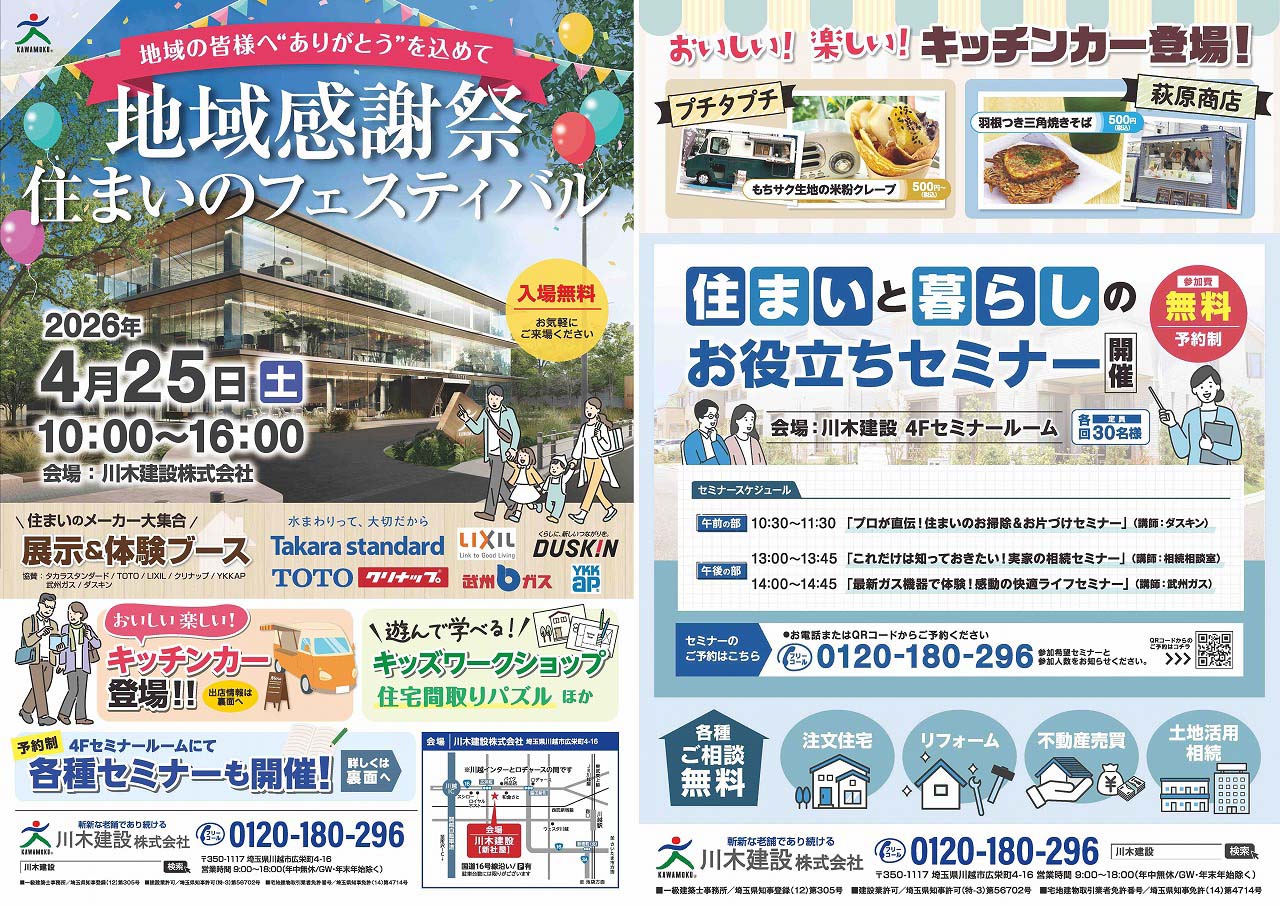 【川越市】ちょっと個性的な楽しい無料イベント♪ 明後日(4月25日)、川木建設が「地域感謝祭」を開催!