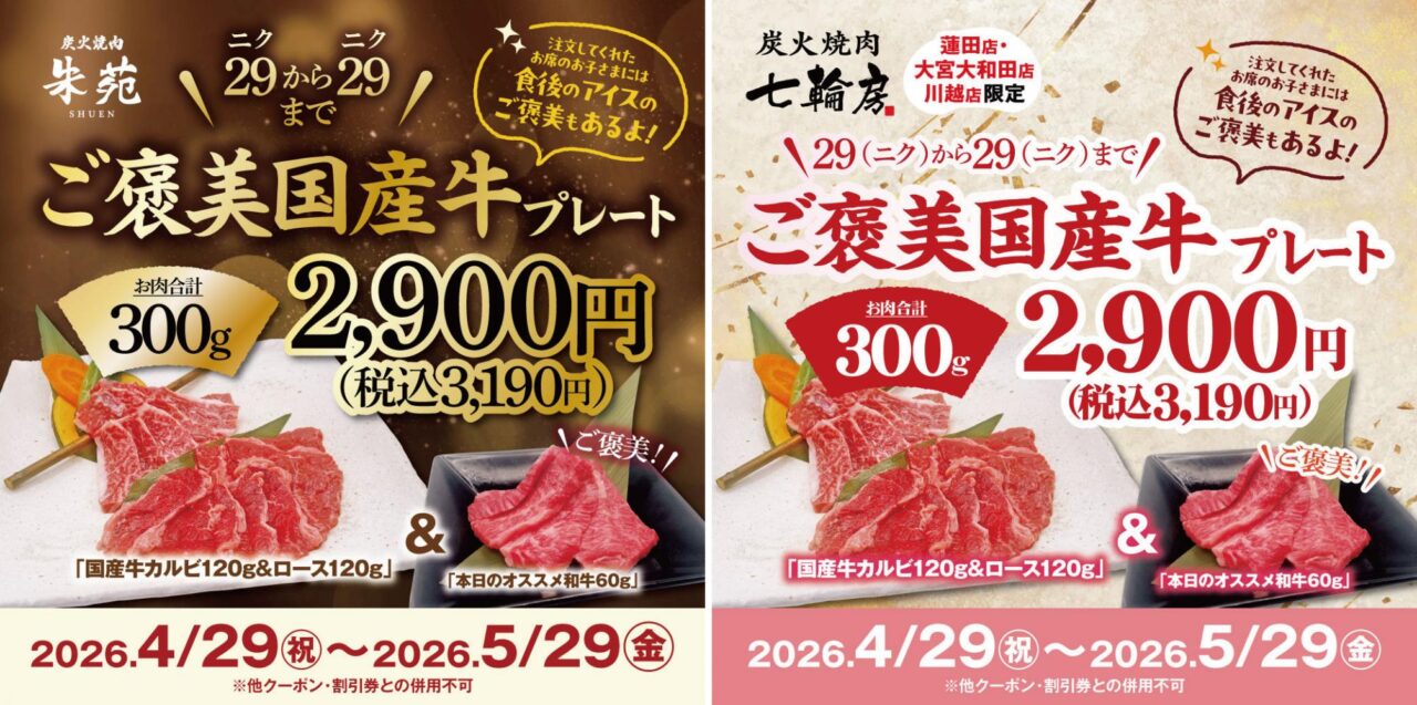 ■対象店舗 :「朱苑」浦和高砂店・新座店 「七輪房」大宮大和田店・川越店・蓮田店